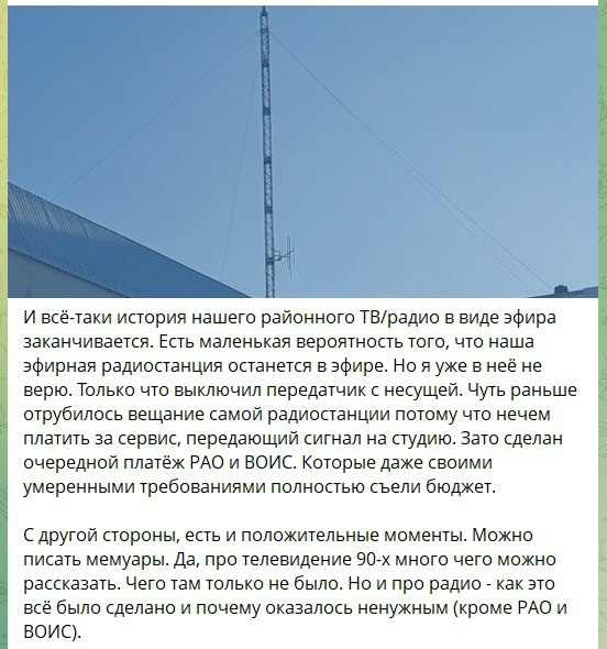 новости из Ставрополья: Только что выключил передатчик с несущей. Чуть раньше отрубилось вещание самой радиостанции потому что нечем платить за сервис, передающий сигнал на студию. Зато сделан очередной платёж РАО и ВОИС. Которые даже своими умеренными требованиями полностью съели бюджет. И на этом фоне радостные пресс-релизы мошенников из так называемой российской академии радио, которая вступила в сговор с РАО-ВОИС хари, её олицетворяющие, решили заработать на комиссии, "сдавая" всю наивную клиентуру, которой обещали оказывать помощь и содействие. Схематоз опубличили ещё пару месяцев назад, до новогоднего алкозагула, но тут уже, после получения права 10 лет дербанить все возможные бюджеты на любую музыку, объявляя её "сиротской", РАР решила напоследок грабануть вещателей по-крупному. Сколько уж тут осталось кружиться-то... Обрубая индустрии крылья, они говорят: мы просто сокращаем коллегам контакт с этим жестоким миром. Не стоит отрываться от земли и пытаться взлететь - или солнц