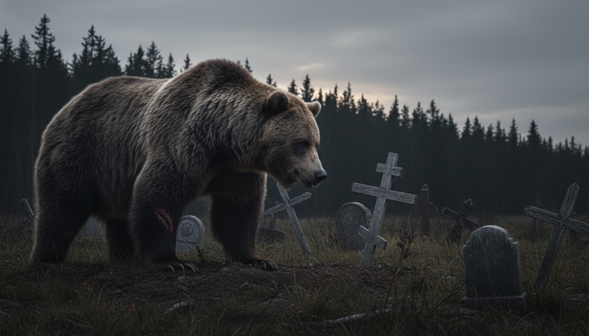 Могила Петра Фёдоровича была в дальнем углу, у самой опушки. Свежая земля, простой деревянный крест, никаких цветов. Я остановилась рядом, огляделась. Лес начинался в нескольких шагах – тёмный, плотный, тихий. Ничего необычного. Никаких следов медведя. Только ветер шумел в ветвях и где-то каркала ворона.