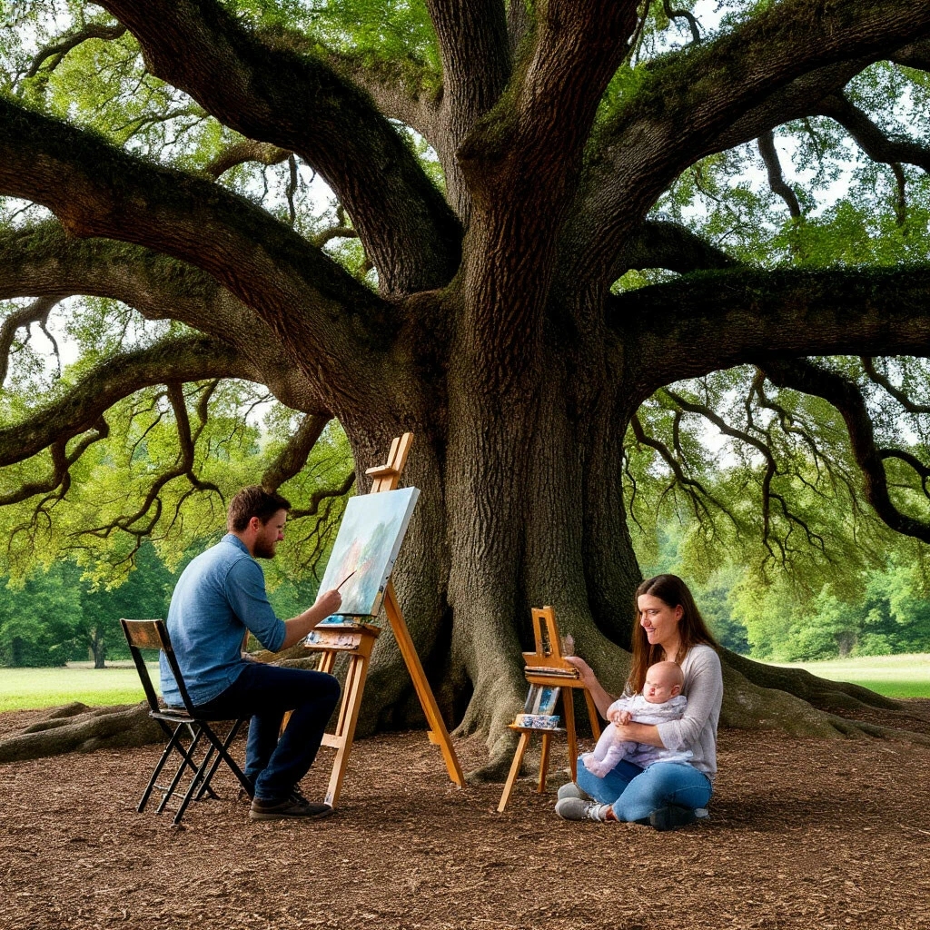У огромного величсественного дуба, под шикарной зеленой кроной, рядом с художником сидела худенькая женщина с младенцем на руках и глядела в даль, вслушиваясь в шум листвы и дыхание своего сонного ребенка.