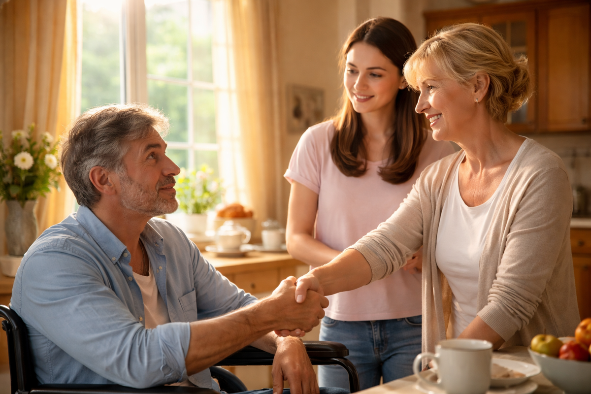 Её встретил мужчина в инвалидном кресле. Окна были плотно занавешены, словно он боялся света. Нижняя часть лица скрывалась под шарфом, завязанным так, будто это была не ткань, а броня. Он смотрел на неё молча, тяжело, без приветствия.