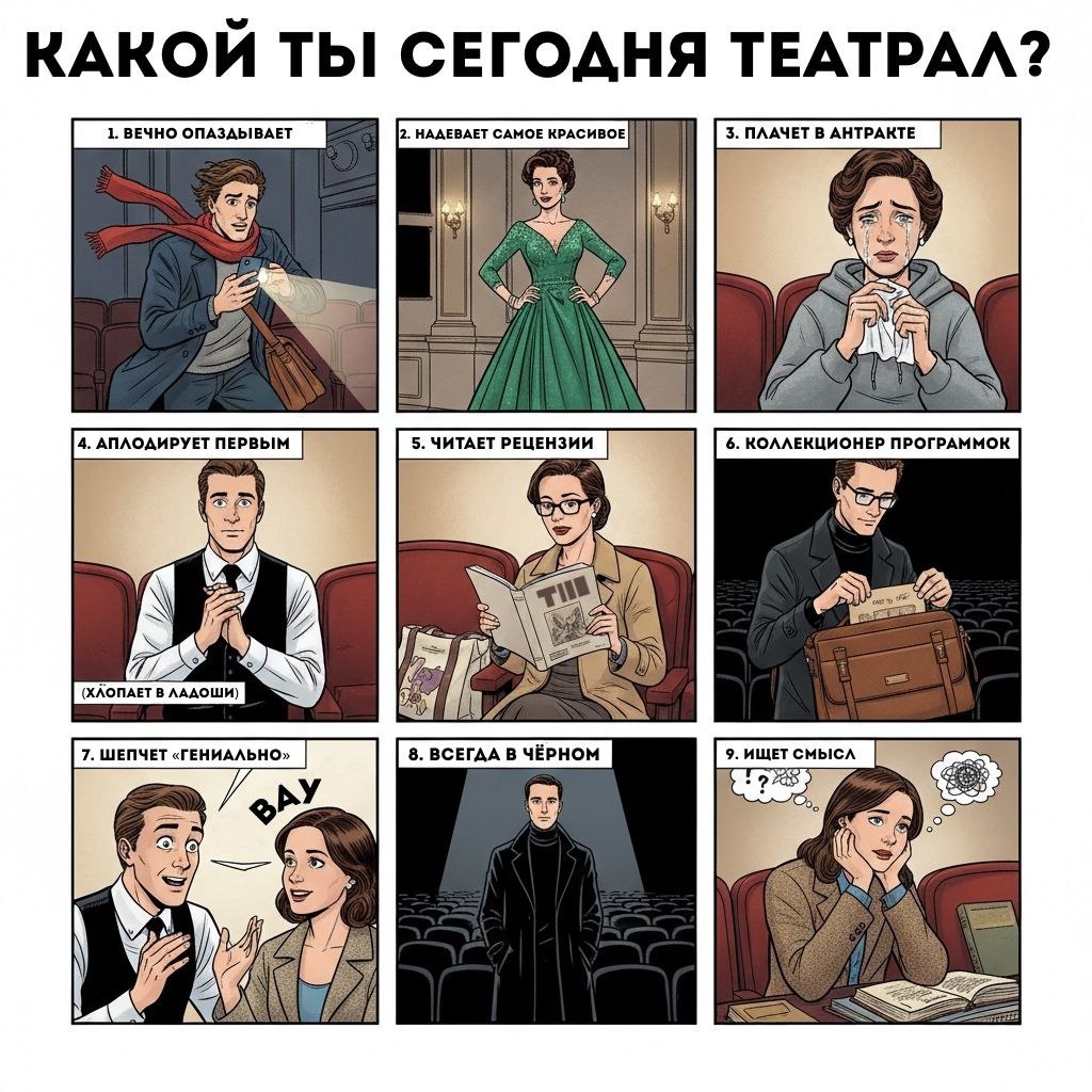 На картинке — девять архетипов театрала. Вечно опаздывающий, одержимый антуражем, сентиментальный плакса(ношу тонированные очки😂😎)или искатель глубинного смысла - кто сегодня про вас? Отмечайте в комментариях 👍