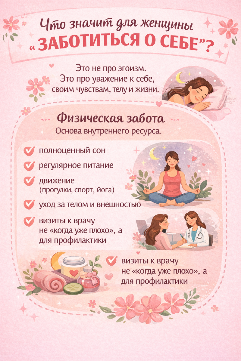 “Cute pastel infographic explaining self-care for women: not egoism but self-respect; focuses on physical care — sleep, nutrition, movement, body care, preventive visits; soft floral design, gentle illustrations” ✅ Подходит для: саморазвития, SMM, здоровья, вдохновения