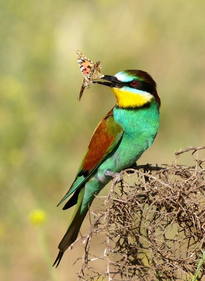 Есть что-то карнавальное и знойное в окраске этой птицы. Тем не менее, северная граница ареала золотистой щурки проходит через Смоленскую, Рязанскую, Нижегородскую области. Золотисто-коричневая спинка, желтая шея, брюшко цвета тропической волны – кажется, что представитель райских птиц заглянул в гости. Тем не менее, золотистая щурка относится к отряду Ракшеобразные, безусловно, является перелетной, проводя зиму на юге Африки, востоке Индии. Здесь щурки, прилетевшие из разных стран, оказываются вместе, и именно в это время происходит спаривание, благодаря чему генофонд внутри вида обогащается новыми сочетаниями генов. Размер тела золотистых щурок несколько меньше скворца. Это насекомоядные птицы, схватывающие добычу на лету. Чаще ловят более крупных насекомых – бабочек, стрекоз, перепончатокрылых. Излюбленная пища – пчелы, за что получили второе название «пчелоедки». Удлиненный, слегка уплощенный, сильный клюв позволяет ювелирно захватывать пчелу и плотно удерживать. В такой исходной п