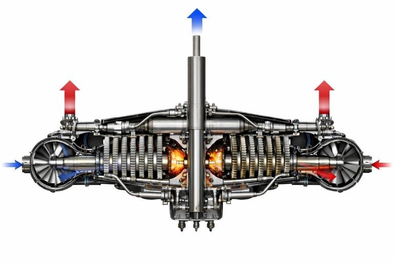 Специалисты Казанского национального исследовательского технического университета имени А.Н. Туполева (КНИТУ-КАИ) представили оригинальную разработку — биротативный газотурбинный двигатель с вертикальной осью вращения ротора. Новая силовая установка ориентирована на применение в винтокрылых летательных аппаратах и других перспективных видах воздушного транспорта с вертикальным взлётом и посадкой. Двигатель выполнен по одновальной компоновке, но с нестандартной архитектурой компрессорной группы. На едином валу последовательно установлены два компрессора: в верхней части — биротативный центростремительный, под ним — центробежный. Между ними образована кольцевая проточная камера, обеспечивающая плавный и эффективный переход воздушного потока от одной ступени сжатия к другой. Воздух забирается сверху через вертикально ориентированный кольцевой воздухозаборник и направляется вниз. Перед попаданием в компрессорную зону поток корректируется входным направляющим аппаратом, после чего проходит