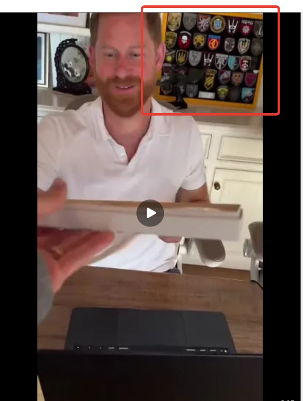 Представьте себе огромный дом в Монтесито, на холмах над океаном, где каждая деталь интерьера кричит о деньгах. По этому дому шагает Меган (на видео мы видим ее тень), у нее в руках набор шоколадок ко дню Валентина, а перед дверью за столом сидит Гарри и за спиной у него висит картина Рембранта. Нет, это во дворце он был окружен произведениями искусства. Теперь все сильно упростилось. Целую! Даже не откусанную ни разу! И принц счастливо улыбается – вот что их высочеству для полного счастья не хватало. Обычно в домах богатых людей висят абстрактные картины или семейные портреты в золоченых рамах. Но у принца Гарри в кабинете на стене висит нечто иное, что никак не вписывается в эту идеальную картинку из глянцевого журнала. Приглядевшись можно различить коллекцию военных шевронов, но не его родной британской армии, где он служил десять лет и прошел два боевых тура в Афганистане. Это нарукавные нашивки окраинских бригад – морской пехоты, десантно-штурмовых войск, Национальной полиции. Мож