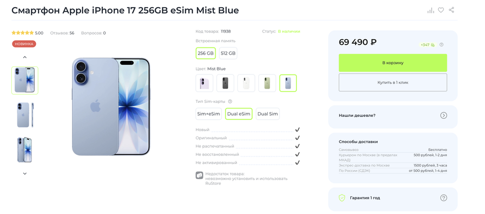 iPhone 17 подешевел в России до 69 000 рублей