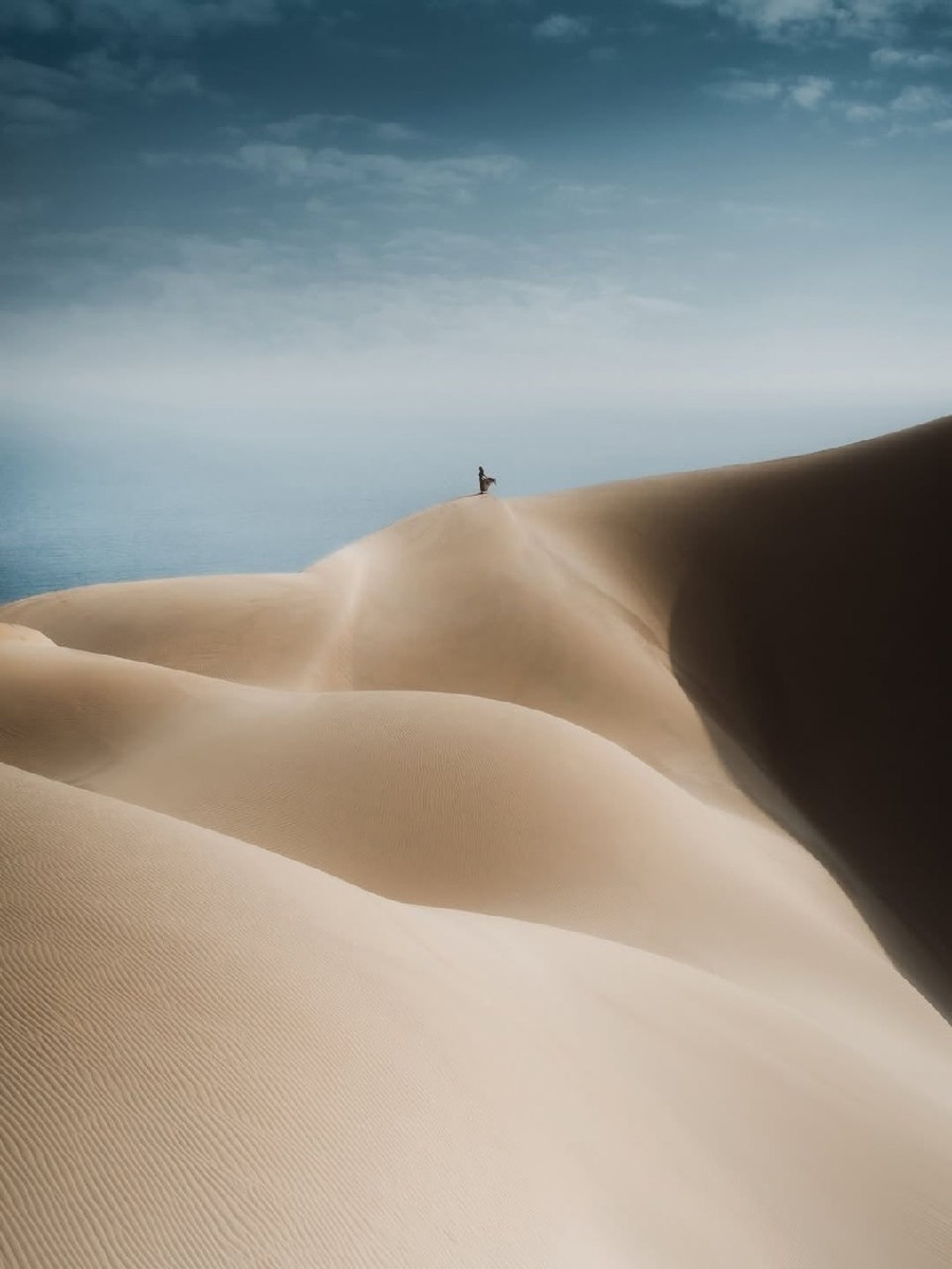 На песчаных дюнах Архер на Сокотре золотые волны поднимаются прямо из Аравийского моря — места, где два мира сталкиваются в тишине