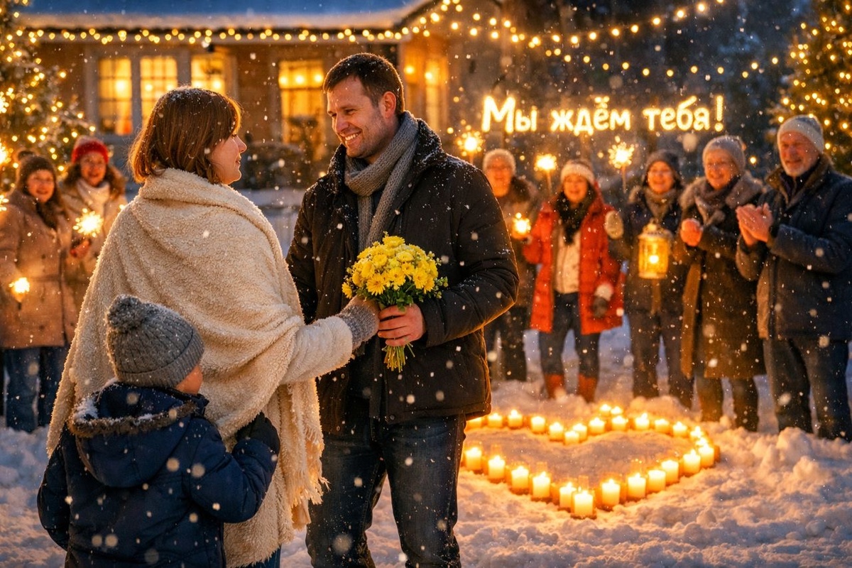 Наталья вышла на улицу, укутанная в тёплый плед, а её сын держал за руку. Мороз щипал щеки, но вокруг царила необыкновенная атмосфера — огоньки свечей, смех друзей и родных, мягкий свет гирлянд.
