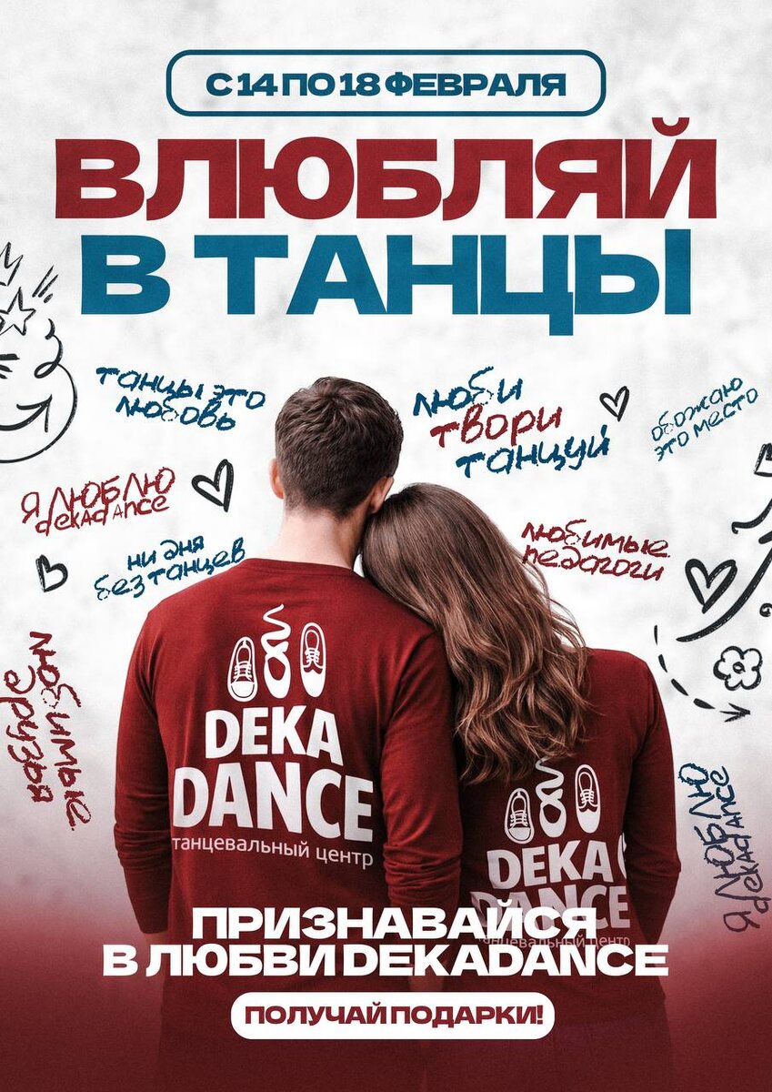 🎁 Любовь — это.... С 14 по 18 февраля в Deka Dance мы предлагаем признаться в самом важном. Центру, который стал вторым домом. Преподавателю, который верит в тебя иногда сильнее, чем ты сам. Одногруппникам, с которыми проживаются не только связки, но и эмоции. Нашим феям-менеджерам, которые делают невозможное возможным. И, конечно, танцу — за свободу, силу и вдохновение. 💌Как принять участие в акции: — Оставь послание на странице 👉»Стена любви» — Найди иконку подарка, кликни, крути колесо удачи (всего один раз) и выигрывай приз — Сделай отметку нашего аккаунта deka_dance в социальных сетях, покажи администраторам и получи купончик на кофе☕️ Но это ещё не всё!👇 🤍Делись с теми, кого любишь: С 14 по 18 февраля любой ученик может привести друга на бесплатное пробное занятие. А если друг приобретает абонемент прямо на месте — вы получаете кэшбек 25% с его покупки. ✨Акция действует с 14 по 18 февраля. Любовь живёт в танцевальном зале — почувствуй её ритм! *призовые часы добавляютс