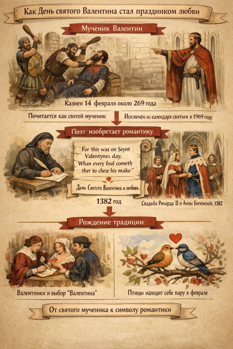❤️💕 Этап 1. Всё началось не с роз и шоколада, а с крови и веры. В Римской империи, около 269 года, христианский священник Валентин отказался отречься от своей веры. Император Клавдий II приказал казнить его 14 февраля: сначала избили дубинками, потом обезглавили. 🏛⚔️ Церковь почитала его как святого мученика до 1969 года, католики тихо убрали из святых. ⛪️ Этап 2 подарок на свадьбу 🎁🧿 в виде поэмы. 20 января 1382 года король Англии Ричард II женился на Анне Богемской. Уже в 14 лет (1381 год) Ричард проявил себя: лично подавил Крестьянское восстание — вышел к бунтовщикам в Смитфилде и сумел их успокоить (один из самых известных эпизодов его правления). К этой королевской свадьбе придворный поэт Джеффри Чосер написал поэму «Птичий парламент». 🏰👑 Именно в ней впервые в истории день святого Валентина связали с любовью: «Потому что это был день святого Валентина, Когда каждая птица приходит выбрать себе пару» 🐦❤️ В Средневековье верили: в середине февраля птицы начинают иска