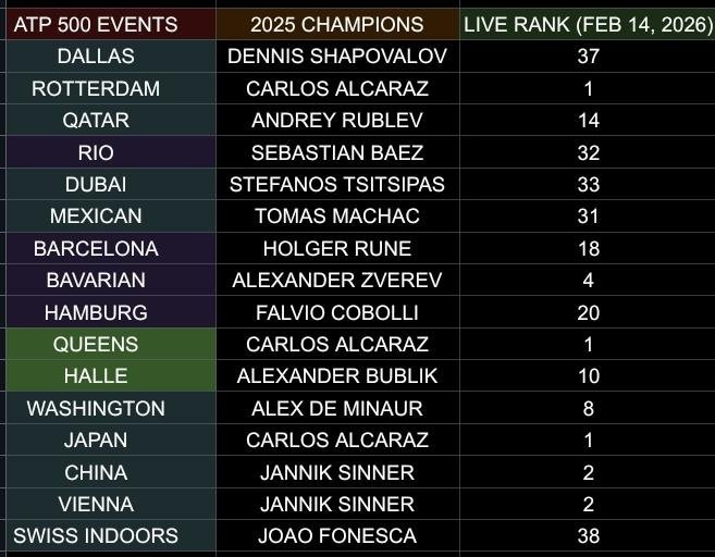 А как насчет ATP 500? В Далласе и Роттердаме сейчас проходят турниры, и похоже, что через несколько дней там будут новые чемпионы (Алькарас не защищал свой титул в Роттердаме). Здесь есть несколько игроков, занимающих 20-е или 30-е места в рейтинге. Они могут здесь победить, поскольку некоторые из этих турниров ATP 500 точно будут пропущены топовыми игроками. На фото чемпионы ATP 500 2023 года: Денис Шаповалов Карлос Алькараз Андрей Рублев Себастьян Баэз Стефанос Циципас Томаш Махач Хольгер Руне Александр Зверев Флавио Коболли Александр Бублик Алекс Де Минаур Янник Синнер Жоао Фонсека Подпишись на Эйс и точка