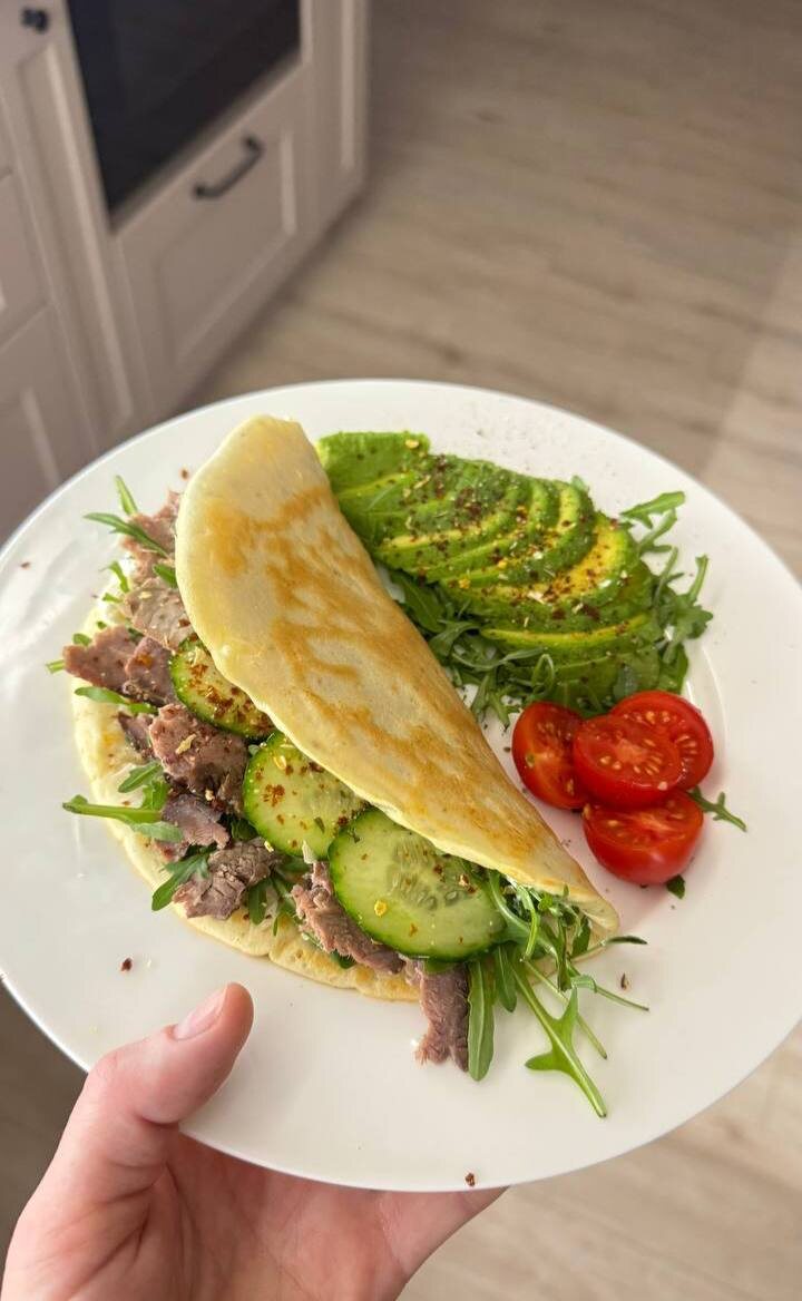 Сегодня был вкусный белково-рисовый блинчик с мясом