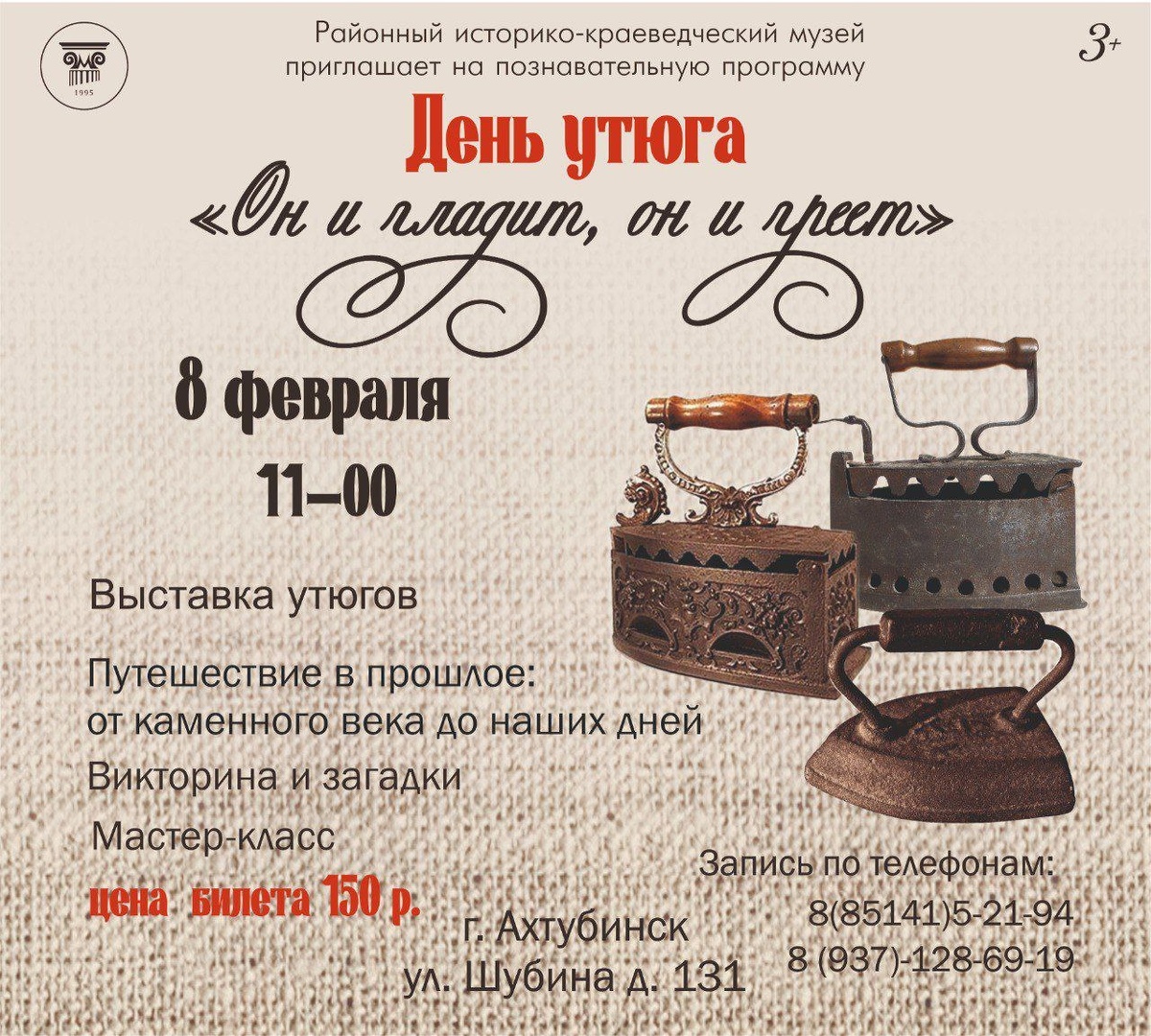 ? Приглашаем в Ахтубинский музей! Вы окунетесь в удивительный мир истории быта на уникальной программе «День утюга» в нашем музее! Вы узнаете: - как выглядели первые приспособления для разглаживания одежды; - какие материалы и технологии использовались в разные эпохи; - как эволюционировал утюг от примитивных приспособлений до современных высокотехнологичных устройств. Не упустите шанс взглянуть на привычный предмет с новой стороны и открыть для себя удивительные страницы прошлого!