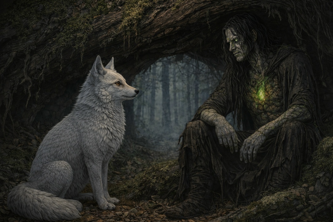 От нагромождения гнилых пней отделилась неясная фигура. Затем ещё одна – со стороны кривого ствола, опоясанного белёсой плесенью. Элвин замер, шерсть на загривке встала дыбом. Он сразу понял: это не живые существа. Из темноты под гигантскими грибами на них уставились пустые глазницы.