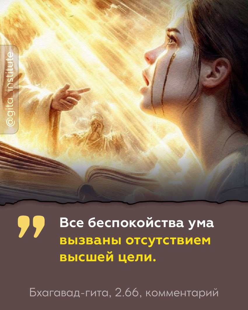 Такой человек не знает умиротворения, а без умиротворения разве можно быть счастливым? ©Бхагавад-гита 2.66 Комментарий Шрилы Прабхупады: Тот, кто лишен сознания Кришны, не знает умиротворения. В пятой главе «Бхагавад-гиты» (стих 29) сказано, что подлинное умиротворение человек обретет только тогда, когда поймет, что Кришна наслаждается всеми жертвоприношениями и плодами всего аскетизма, что Он верховный повелитель всех планет во вселенной и истинный друг всех живых существ. Если человек не обладает сознанием Кришны, его ум будет бесцельно блуждать, не приходя ни к какому выводу. Все беспокойства ума вызваны отсутствием высшей цели, и, когда человек наконец понимает, что Кришна — верховный наслаждающийся, владыка всего сущего и друг каждого, его ум успокаивается и он обретает умиротворение. Вот почему тот, чья деятельность не связана с Кришной, всегда чем-то обеспокоен, чем бы он ни занимался и как бы ни пытался создать видимость умиротворенности и духовности. Сознание Кришны — это