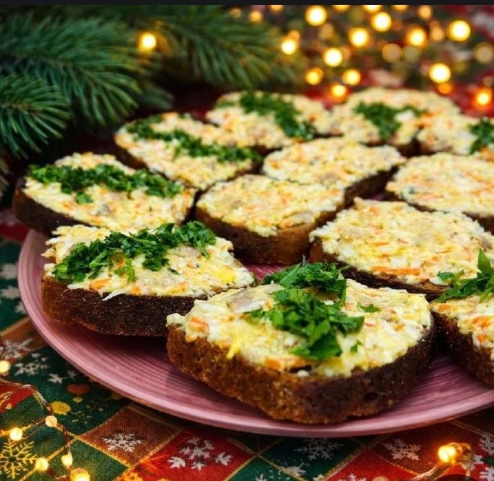 ИНГРЕДИЕНТЫ: ✅ Хлеб чёрный — 10–12 ломтиков ✅ Сельдь слабосолёная — 1 шт. ✅ Яйца варёные — 3 шт. ✅ Морковь по-корейски — 150 г ✅ Сырок плавленый (сливочный) — 1 шт. ✅ Майонез — 2 ст. л. ✅ Чеснок — 5 зубчиков ✅ Соль — по вкусу ✅ Чёрный молотый перец — по вкусу ✅ Петрушка — 3–4 веточки ПРИГОТОВЛЕНИЕ: 1. Чёрный хлеб подсушить на сухой сковороде на слабом огне по 4–5 минут с каждой стороны до хрустящей корочки. Горячие гренки сразу натереть разрезанным зубчиком чеснока. 2. Сельдь разделать: удалить голову, хвост, внутренности, хребет и кожу. Филе нарезать мелким кубиком. 3. Яйца натереть на мелкой тёрке и добавить к сельди. 4. Плавленый сырок натереть на мелкой тёрке и отправить в миску. 5. Морковь по-корейски отжать от лишней жидкости и мелко нарезать, добавить к остальным ингредиентам. 6. Добавить измельчённый чеснок, соль и чёрный перец по вкусу. 7. Вмешать майонез, добиваясь густой, пластичной намазки, которая хорошо держится на хлебе. 8. Намазать массу ровным слоем на чесночн