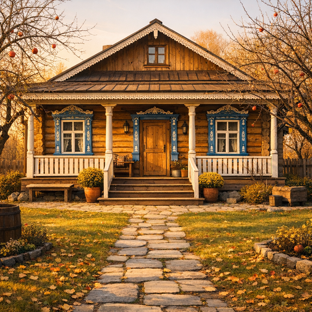 Дом появился за поворотом — старый, но ухоженный. Деревянный, с резными наличниками, покрытыми облупившейся синей краской. Широкое крыльцо с тремя ступенями. Вдоль забора — яблони, голые и корявые в осеннем воздухе.