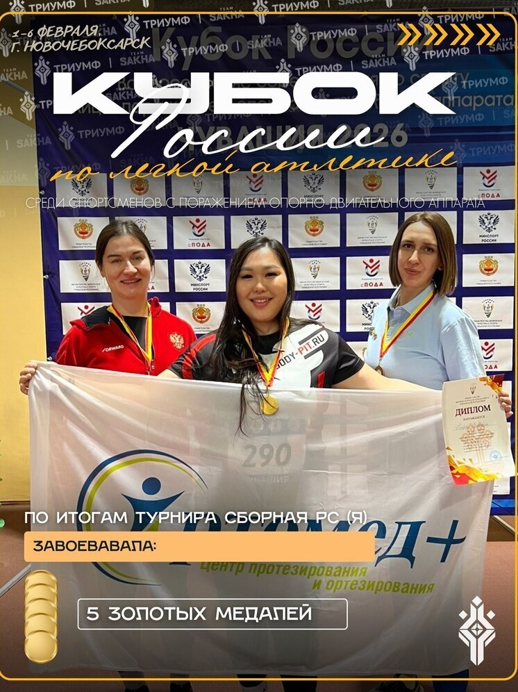 С 1 по 6 февраля в Новочебоксарске прошел Кубок России по легкой атлетике среди спортсменов с поражением опорно-двигательного аппарата (ПОДА). Сборная Республики Саха (Якутия) продемонстрировала феноменальный результат, завоевав серию золотых медалей и обновив сразу три национальных рекорда. Главные герои соревнований:• Саргылан Семёнов стал двукратным победителем Кубка, придя первым на дистанциях 60 м и 400 м (результат на 400 м — 51,95 сек).• Айаал Сивцев завоевал золото в толкании ядра с результатом 12,05 м, что стало новым рекордом России.• Роман Ибрагимов первенствовал в прыжках в длину: его прыжок на 6,35 м также признан новым рекордом страны.• Виктория Петрова поднялась на высшую ступень пьедестала в толкании ядра. Ее результат 10,23 м стал третьим рекордом России, установленным якутянами на этом турнире. Выступление якутских легкоатлетов подтвердило их лидерские позиции в российском паралимпийском спорте.
