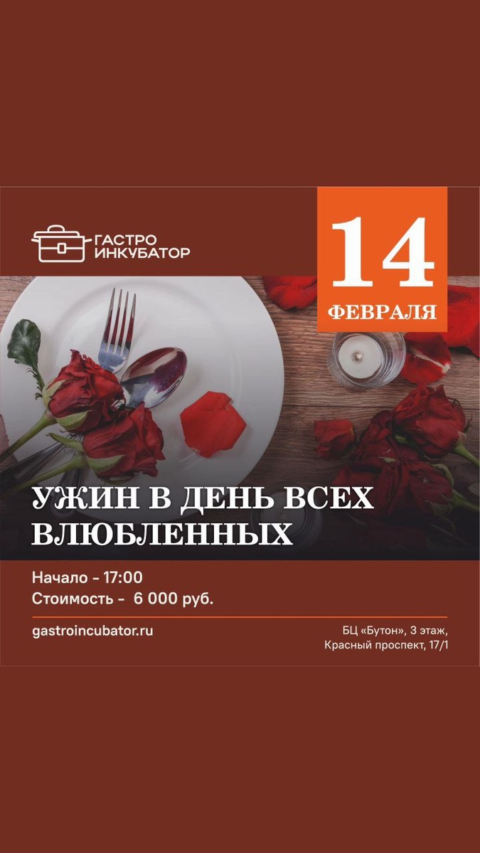 влюбленных в "Гастроинкубаторе" - погружение в мир вкуса и романтики. 🌹 Меню ужина: 🍽️ Amuse Bouche Крем романоф с сыровяленой утиным грудкой 🐟 Main Course Мурманский лосось с чечевицей белуга и соусом Шато Шалон 🍋 Сорбет Лимон с Водкой Освежающий сорбет, который взбодрит ваши чувства и подготовит к следующему кулинарному открытию. 🥩 Стейк Филе Говядина С сочным картофелем доффинуа, мисо и имбирем 🍤 Блюда из креветок 🦪 Устрицы 🍰 Desert Белый торт — сладкое завершение вечера, которое оставит вас с легким послевкусием счастья. Каждое блюдо будет сопровождаться тщательно подобранными напитками, которые подчеркнут его уникальность и добавят нотки волшебства в ваш вечер. Адрес: Красный проспект 17/1, 3-й этаж Дата мероприятия - 14 февраля 🕖 Сбор гостей: 16:30 ч 🍽️ Начало ужина: 17:00 ч Звоните и записывайтесь: +7 913 916 98 82 +7 913 007 68 78