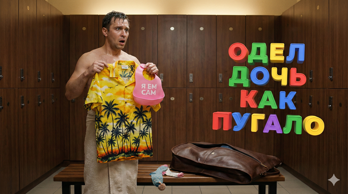 Он начал судорожно рыться в карманах кофра, надеясь, что это какая-то ошибка, что нормальные вещи где-то на дне. Но нет. Брюк не было вообще. Вместо них лежали его старые тренировочные штаны с вытянутыми коленками. А вишенкой на торте, финальным аккордом этой симфонии абсурда, был галстук. Точнее, его отсутствие. На его месте лежал детский клеенчатый слюнявчик с кармашком для крошек и надписью: «Я кушаю сам».