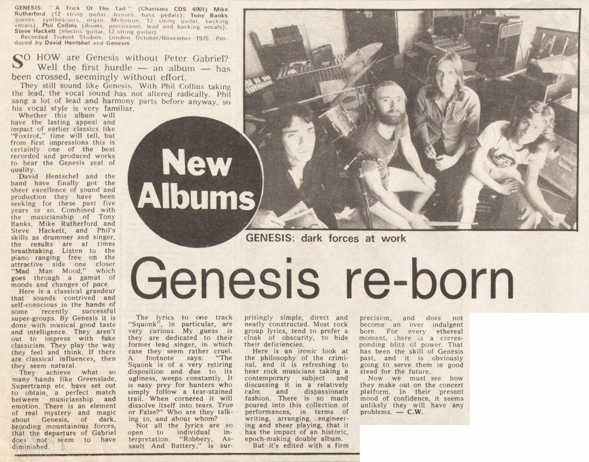 7 февраля 1976 года опубликован обзор на "A Trick of the Tail" в издании Melody Maker (автор: Крис Уэлч). Примечательно, что это впервые в истории Genesis, когда в прессе выходит обзор на альбом, который еще не вышел в продажу (релиз альбома состоится только через 6 дней, 13 февраля - к слову, в день рождения Питера Гэбриэла). А всего 7-го числа вышло 2 обзора в разных изданиях, но о втором речь чуть позже. Так каково же звучание Genesis без Питера Гэбриэла? Что ж, первое испытание - выпуск альбома - они преодолели, судя по всему, без особых усилий. Группа по‑прежнему звучит как Genesis. Поскольку Фил Коллинз взял на себя ведущую роль, вокальное звучание не претерпело радикальных изменений. Фил и раньше исполнял множество ведущих и гармонических партий, поэтому его вокальный стиль хорошо знаком слушателям. Пока неизвестно, обретёт ли этот альбом такую же долговременную привлекательность и влияние, как более ранние классические работы вроде Foxtrot, - время покажет. Но по первым впечатл