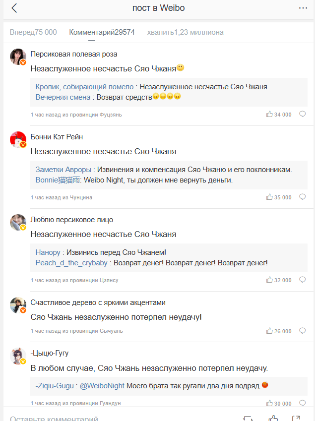 Продолжается полемика по поводу центрального места на церемонии Weibo Night, которая прошла 5 февраля. Фанаты до сих пор продолжают споры. Больше всего достается Ян Ми, репутация которой сильно пострадала от слухов в соцсетях, что ее дорамы проваливаются, актерское мастерство посредственное, главных ролей никто не предлагает, так что "пожилая" женщина вынуждена мухлевать с центральным местом на посредственной церемонии, чтобы оказаться на равных с актрисой, признанной на международном уровне. То есть на месте, которое Ян Ми по своему статусу не заслужила. И что от ее завышенных требований к организаторам пострадал Сяо Чжань и его фанаты, которые в комментариях к заявлению Вэйбо массово требуют вернуть деньги на билеты и проезд. Так что на официальной страничке Weibo Night организаторы выложили еще одно заявление, поскольку предыдущее сухое извинение в две строчки только вызвало еще больше ругани между фандомами, и фандом Сяо Чжаня продолжал требовать персональных извинений. Всем друз