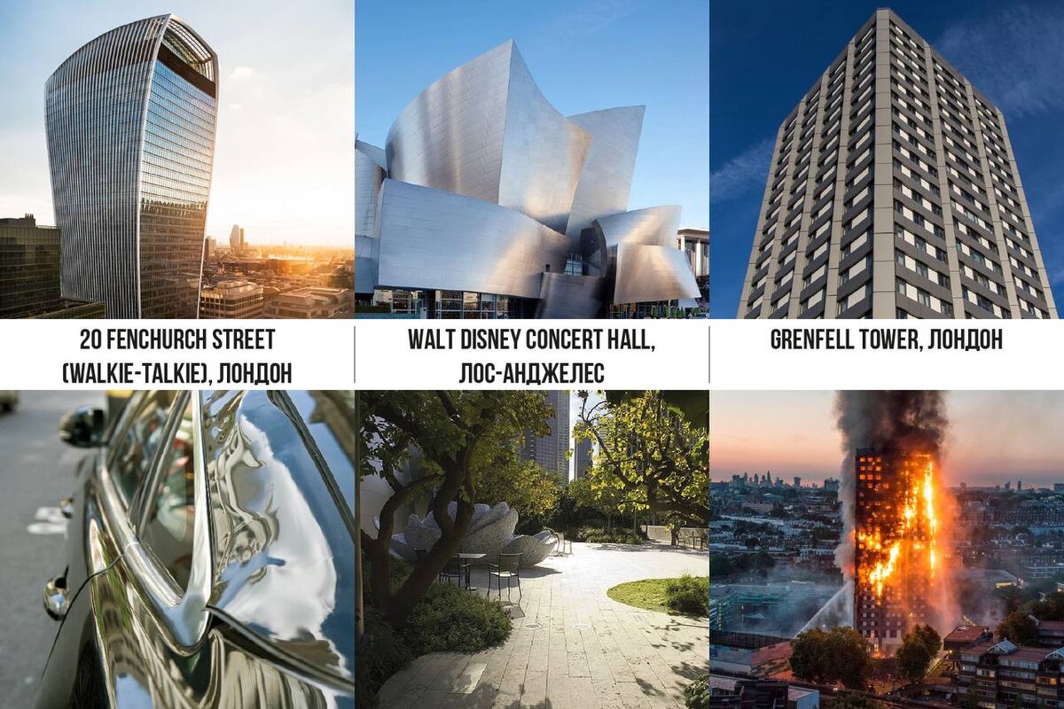 В архитектуре есть опасная точка — момент, когда эффектная идея перестаёт быть просто формой и начинает влиять на реальную жизнь людей. Иногда — слишком сильно. История знает случаи, когда выразительные решения приводили к серьёзным последствиям и заставляли пересматривать нормы проектирования. 🏙 20 Fenchurch Street (Walkie-Talkie), Лондон Стеклянный вогнутый фасад сработал как гигантская линза. Солнечные лучи фокусировались в одной точке: плавились детали автомобилей, перегревались поверхности, люди чувствовали ожоги от отражённого света. Здание пришлось срочно дорабатывать. ✨ Walt Disney Concert Hall, Лос-Анджелес Скульптурный металлический фасад стал источником ослепляющих бликов и сильного перегрева окружающих пространств. Жители соседних домов жаловались на невыносимую жару и свет. Часть панелей пришлось матировать, чтобы снизить отражение. 🔥 Grenfell Tower, Лондон Фасад, выбранный ради обновлённого облика и экономии, превратился в проводник огня. Во время реновации использ