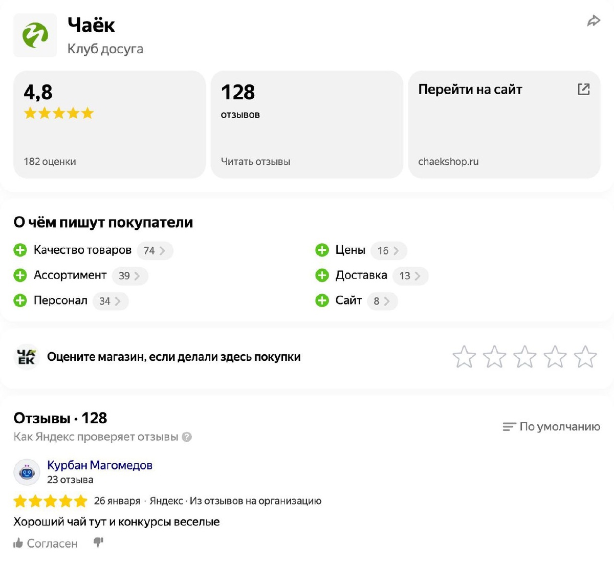 ? Друзья, очень хотим попросить вас рассказать о своих впечатлениях о нашем проекте. Можете рассказать о посещении нашего магазина, поделиться опытом дегустации на чайной встрече или пользовании нашим интернет-магазином. Будем рады всему! Пожалуйста, оставьте отзыв в сервисе «Яндекс Карты» по ссылке ниже: 👉 reviews.yandex.ru/shop/chaekshop.ru Ваши оценки и комментарии помогут другим клиентам узнать больше о нас! С любовью, ваш ЧАЁК 💚