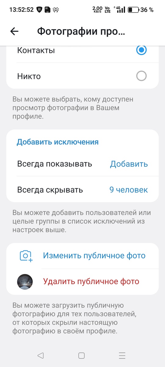 - Появилась функция «Публичное фото». Например: у вас в профиле в Телеграме есть свои личные фотографии и вы хотите, чтобы незнакомые люди их не видели и поставили ограничение, что фотографии в профиле будут видеть только контакты и избранные люди. Но в то же время вы не хотите, чтобы профиль был совсем без аватарки для других пользователей. И выбирать больше не нужно! Одна фотография для всех остальных пользователей и неограниченное количество для контактов и избранных людей.
