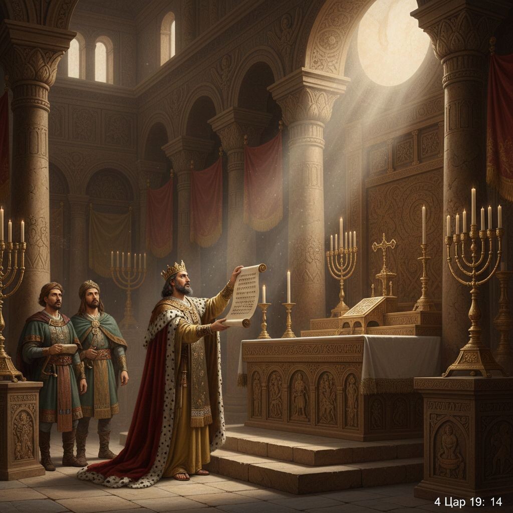 В своей молитве он: признаёт Бога единственным владыкой всех царств земли, Творцом неба и земли («Ты один Бог всех царств земли, Ты сотворил небо и землю»); противопоставляет ложных богов ассирийцев Живому Богу, подчёркивая, что идолы — это «изделие рук человеческих, дерево и камень»; просит Бога спасти Иерусалим не только ради народа, но ради Своей славы и ради Давида, раба Его («И ныне, Господи Боже наш, спаси нас от руки его, и узнают все царства земли, что Ты, Господи, Бог один»); #ечб2026 #ечбфевраль2026