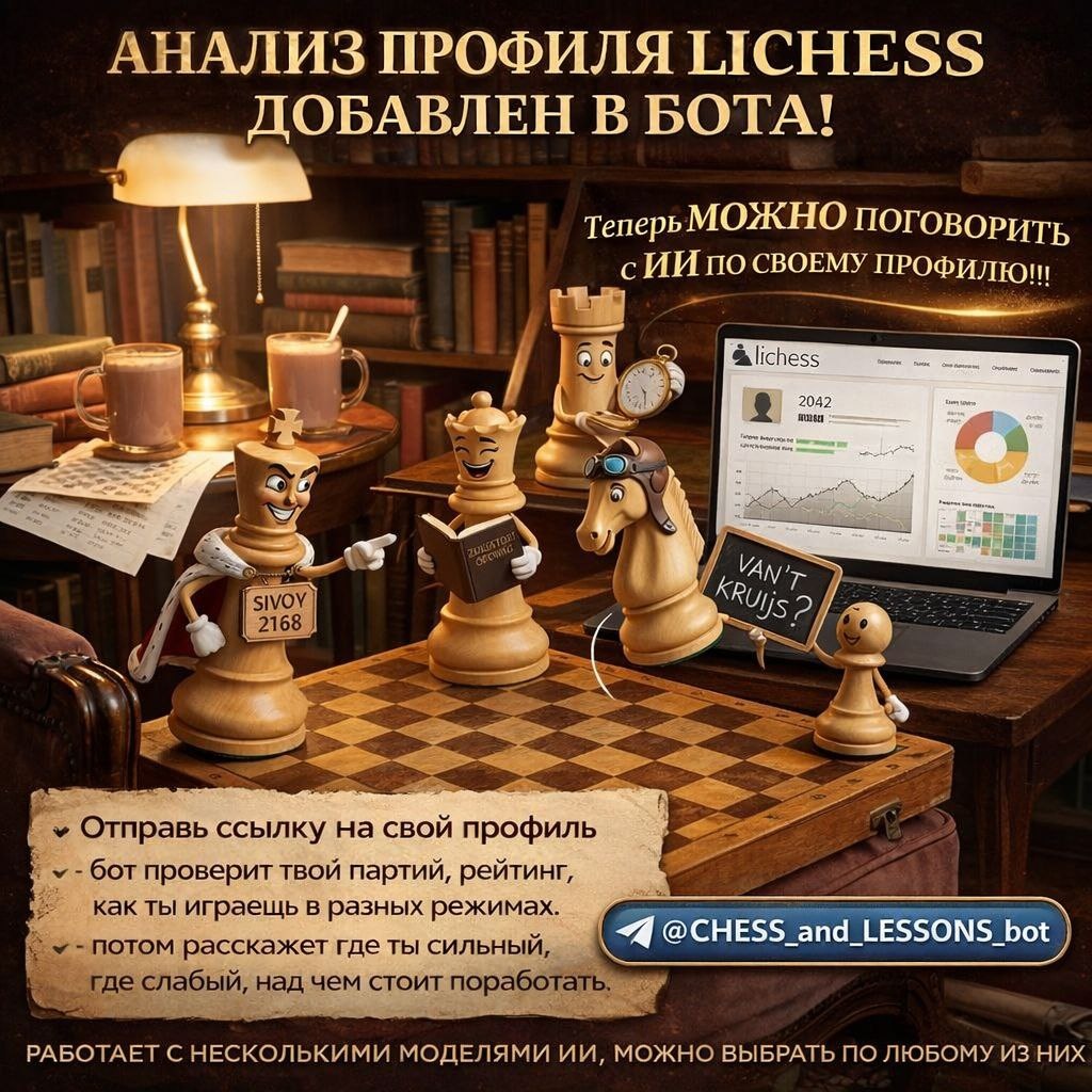 ! Ну что, народ. Мы перевалили за тысячу. 1008 человек, если быть точным - но кто считает (я считаю). Когда запускал бота, думал: «ну, человек 50 попробуют и забудут». А тут тысяча. Причём 33 новых только за эту неделю. А знаете что самое интересное? Я на днях добавил анализ Lichess-профиля - и он сразу стал фичей №1. 337 использований за неделю. Люди реально хотят знать, где у них дыры в игре. Бот скажет: «братан, у тебя блиц 1400, а рапид 1800 - может хватит играть пулю в 3 часа ночи?» Ну, примерно так. Спасибо всем, кто пользуется. Это реально мотивирует пилить дальше. Впереди много нового 🚀 @CHESS_and_LESSONS_bot - если ещё не пробовал