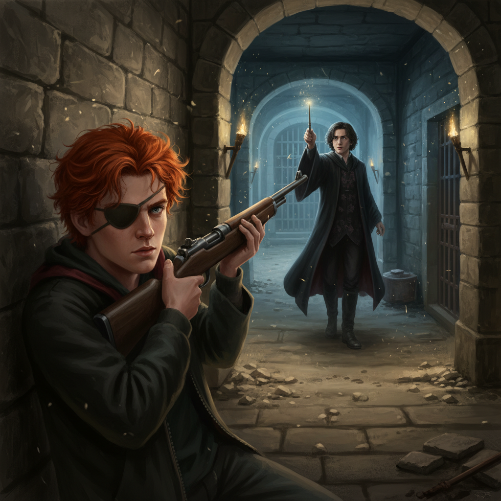 Раздался треск, а затем ударная волна отбросила их всех к противоположной стене. Взрыв прошёлся по всему коридору, и часть стен треснула, оставив бетонные сыпучие раны. Первым очухался Джордж. Вскочив на ноги, он резко бросился в камеру, где увидел подвешенного на цепях Дамблдора.