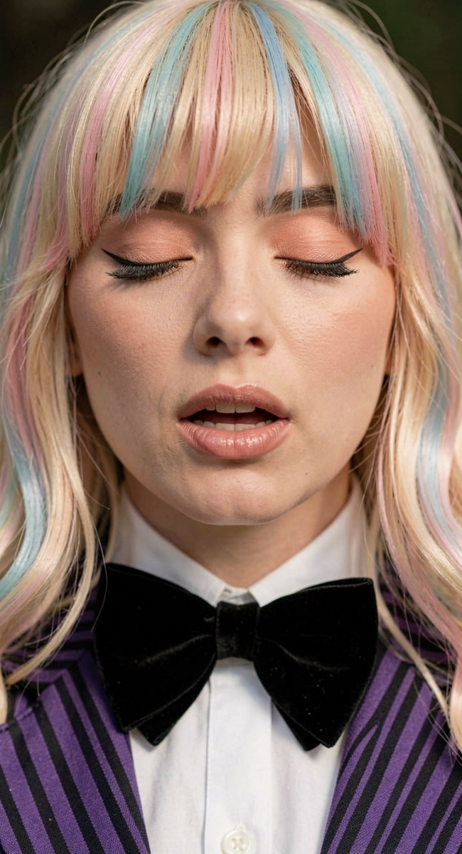 ! 🧡🖤 Создадим атмосферный портрет в стиле Энид Синклер с идеальной детализацией бархатного банта и пастельных прядей Какая картинка вам нравится больше? 1️⃣ Первая ставь 👍 2️⃣ Вторая ставь 🔥 📝 Промт 1️⃣ первой картинки: Extreme close-up shot of a young woman as Enid Sinclair character from Wednesday series, eyes closed, mouth slightly open as if sighing or singing. Blonde hair with pastel pink and blue highlights, thick bangs. Wearing Nevermore Academy uniform: purple and black striped blazer, white high-collar shirt, and a large black velvet bow tie. Soft peach eyeshadow, natural lip gloss. Cinematic lighting, shallow depth of field, high detail skin texture, 8k resolution, masterpiece 📝 Промт 2️⃣ второй картинки: blond haired girl with pink hair and a bow tie, tiktok 4 k uhd image, ahegao, jenny seville, rainbow colored hair, film still of harley quinn, aurora colored hair, colorful hair, rainbow hair overlay, chloe moretz, sexy face with full makeup, rainbow hair, movie stil
