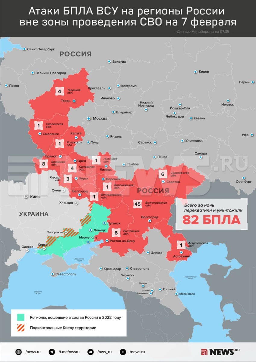 45 из них сбили в Волгоградской области, восемь — в Брянской, по шесть — в Ростовской и Саратовской, по четыре — в Орловской и Тверской, три — в Курской, еще по одному — в Астраханской, Белгородской, Воронежской, Калужской, Липецкой и Смоленской областях. ⭕️ Подписаться | Мы в MAX | Буст