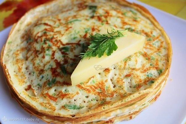🥣♥️ Сырные блины с зеленью Ингредиенты Молоко — 1,5 стакана Яйцо — 2 шт. Мука — 1 стакан Сыр — 150 г Соль — 1 ч.л. Сахар — 1 ч.л. Разрыхлитель — 1 ч.л. Растительное масло — 2 ст.л. Укроп — по вкусу Приготовление: 1. Смешать теплое молоко с сахаром, солью и яйцами. 2. Добавить просеянную муку с разрыхлителем. 3. Сыр натереть на мелкой терке, добавить в жидкую массу. 4. Затем добавить мелко порубленную зелень и растительное масло. 5. Хорошо размешать венчиком. Выпекать на смазанной маслом и раскаленной сковороде с двух сторон. 6. Готовый блинчик смазать сливочным маслом. Очень вкусны в горячем виде (в любое время можно разогреть в микроволновке). Приятного чаепития! 💖 Вкусная Жизнь