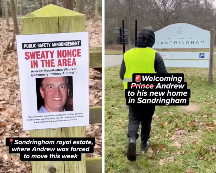 В связи с переездом Эндрю по всему Сандрингему развешаны объявления об "опасности". Пока бывший принц обживается в королевском поместье в Норфолке, местные жители развесили по всему району предупреждающие знаки, указывающие на связь Эндрю с Эпштейном. На этой неделе Эндрю выгнали из Королевской ложи в Виндзоре и он среди ночи, чтобы избежать привлечения внимания, был перевезен в королевское поместье Сандрингем в Норфолке, Предполагается, что он остановился в коттедже Вуд-Фарм, в то время как Марш-Фарм, который, как считается, станет его постоянным местом жительства, все еще находится на стадии необходимого ремонта. Через несколько дней после прибытия Эндрю местные жители ясно выразили свое недовольство переездом опозоренного члена королевской семьи в этот район. На видео, опубликованном в соцсети группой активистов Everyone hates Elon, видно, как неопознанный местный житель клеит лист бумаги на табличку "Добро пожаловать в Сандрингем". На новом объявлении, которое описано как "предуп