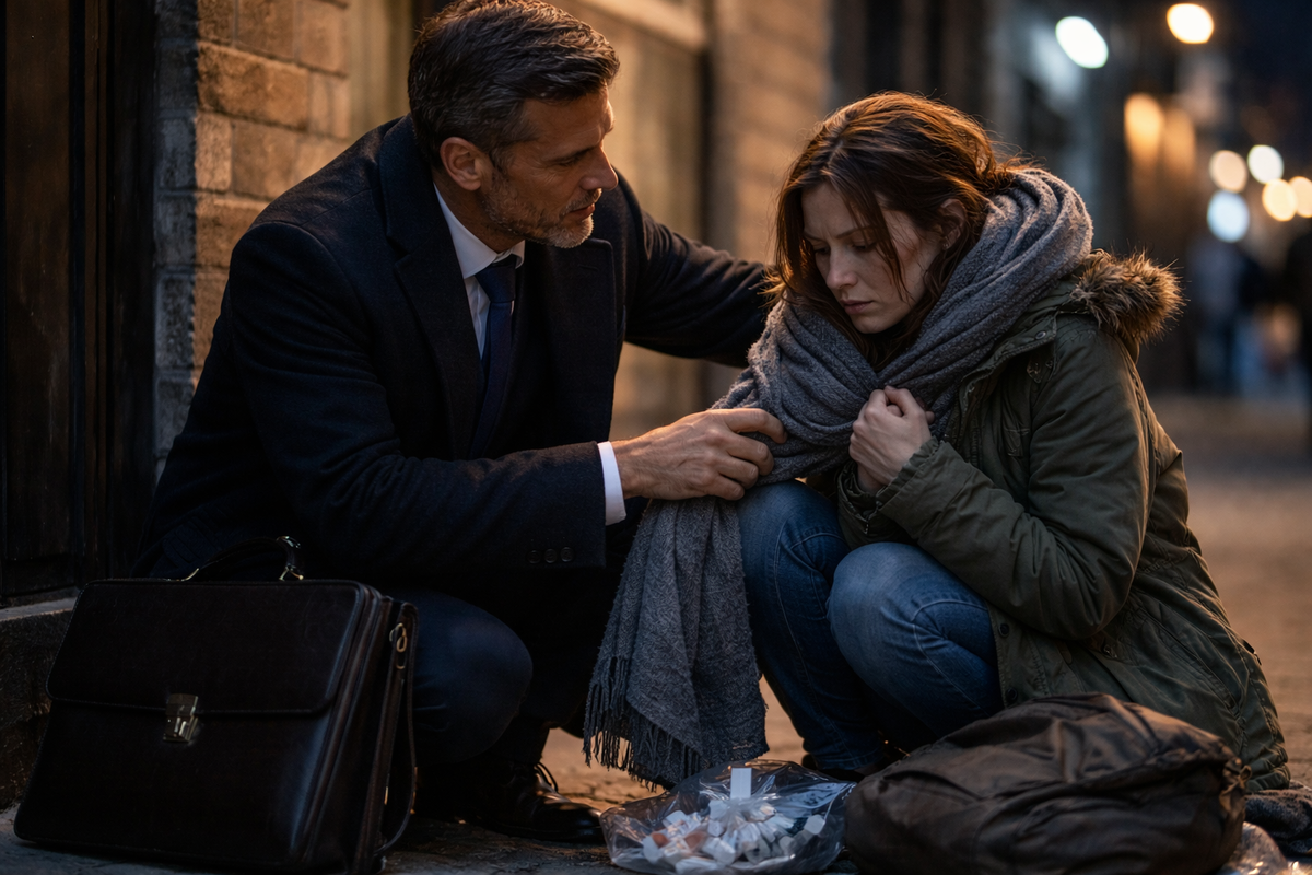 Иногда одно доброе дело возвращается самым неожиданным образом. Он заметил её не сразу. Сергей вообще редко кого-то замечал. Водитель открывал дверь, он выходил из машины, шел быстрым шагом — встречи, контракты, цифры. Люди вокруг были фоном. Улицей. Шумом. В тот вечер он, как обычно, торопился. День был тяжелым, голова гудела, телефон разрывался от сообщений. Сергей уже почти дошел до машины, когда взгляд зацепился за фигуру у стены старого магазина. Она сидела прямо на холодном бетоне. Худенькая, в слишком тонкой куртке. Голова опущена, руки дрожат. Рядом — небольшой рюкзак и пакет с лекарствами, которые, судя по всему, так и не были куплены. Сергей прошёл мимо. Сделал несколько шагов. И вдруг остановился. Он потом долго не мог объяснить себе — почему. — Девушка… — окликнул он, обернувшись. Она подняла глаза. Большие, воспалённые, уставшие. В них не было ни наглости, ни просьбы. Только слабость и стыд. — Вам плохо? — спросил Сергей уже тише. Она едва заметно кивнула. — Мне… просто на