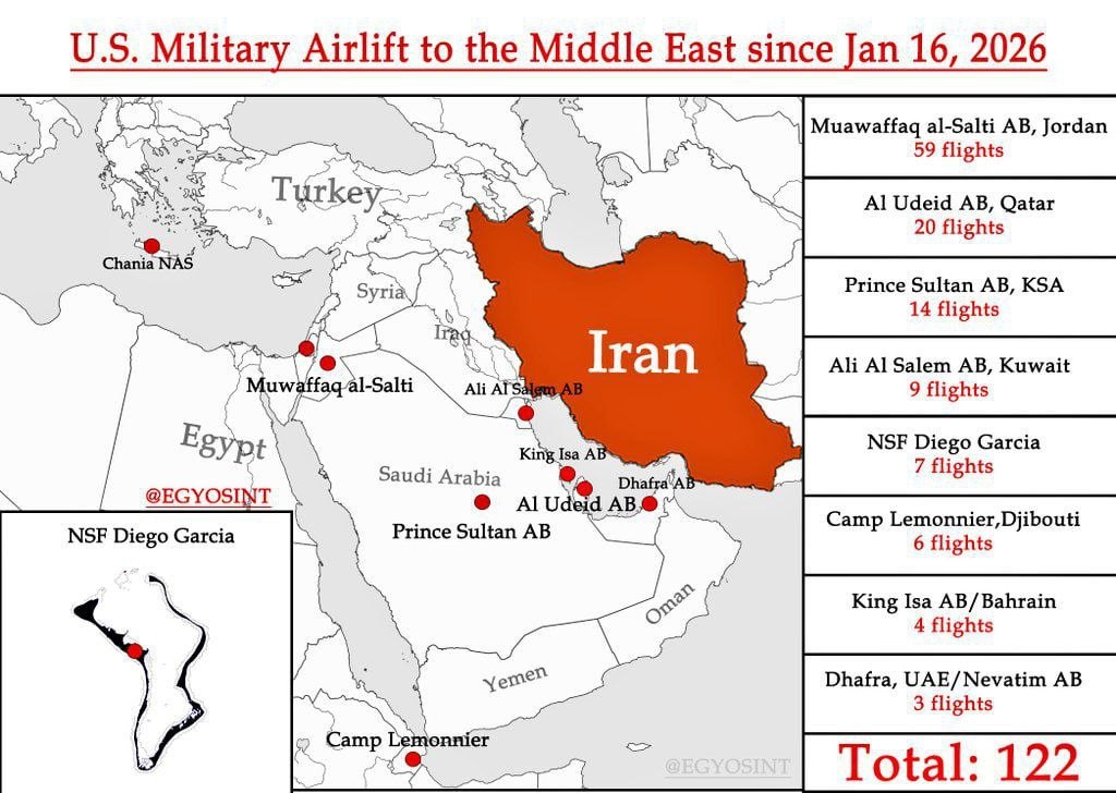 Основная нагрузка пришлась на военно-транспортные самолеты C-17A Globemaster III, которые выполнили 114 рейсов. Еще 8 перелетов осуществили тяжелые транспортники C-5M Super Galaxy. Основной поток воздушных перевозок был направлен на авиабазу Муваффак аль-Салти в Иордании. По всей видимости, активизация авиационного трафика связана с доставкой систем ПВО, сменой воинских контингентов, а также обеспечением общей логистики в рамках наращивания военного присутствия в регионе. География перелетов распределилась следующим образом: 59 рейсов прибыли в Иорданию (Муваффак аль-Салти), 20 — в Катар (Аль-Удейд), 14 — в Саудовскую Аравию (Принц Султан), 9 — в Кувейт (Али-Аль-Салем), 6 — на базу Кэмп Лемонье в Джибути и 7 — на авиабазу Диего-Гарсия. Оставшиеся рейсы были выполнены в Бахрейн (4, включая три на авиабазу Кинг-Иса), ОАЭ (2, Аль-Дафра) и Израиль (1, Неватим). Указанное количество не включает внутрирегиональные перелеты между базами, а также более десятка рейсов, выполненных Транспортн