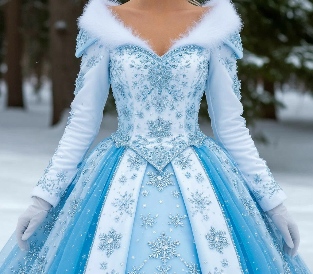 Это платье казалось созданным из самой зимы, застывшей на мгновение по воле великого мастера. Его основа была выполнена из тяжелого шелка оттенка "арктический иней" - не чистый белый, а глубокий цвет с едва уловимым голубоватым подтоном. Поверх шелка струилась тончайшая, почти невидимая вуаль из органзы, расшитая серебряными нитями, толщиной с человеческий волос. А главной изюминкой платья были снежинки. Каждая снежинка представляла собой сложную многоуровневую конструкцию из микроскопических кристаллов горного хрусталя, края лучей которых были инкрустированы крошечными, сверкающими, подобно бриллиантам, маленькими камушками. На длинных, узких рукавах платья снежинки становились совсем мелкими, переходя в россыпь иния. Лиф платья украшал белый, пушистый мех.