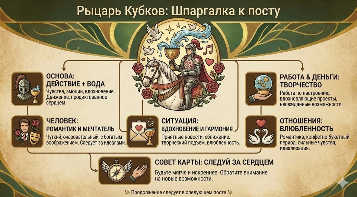 Рыцарь Кубков Мы продолжаем разбирать придворные карты через логику и смысл, а не через заучивание значений. Если пропустили, то мы уже разобрали Рыцаря Пентаклей и Рыцаря Мечей. И сегодня на очереди один из самых «красивых» и противоречивых Рыцарей — Рыцарь Кубков. Карта, которую часто путают с пустыми мечтами или иллюзиями. Но на самом деле она глубже и тоньше. Основа карты Рыцарь — это движение, импульс, процесс. Кубки — чувства, эмоции, отношения, вдохновение, внутренний мир. Если соединить эти значения, получается формула: движение, продиктованное чувствами. Это не про расчет и не про выгоду. Это про порыв сердца, романтический настрой и следование за мечтой. Рыцарь Кубков действует потому, что чувствует. Его мотив — эмоция, интерес, влюбленность, вдохновение. Если карта показывает человека Рыцарь Кубков — это человек, который: — чуткий и тактичный — живет идеалами — легко загорается — следует за мечтой Он умеет красиво говорить, очаровывать, вдохновлять. Часто становится