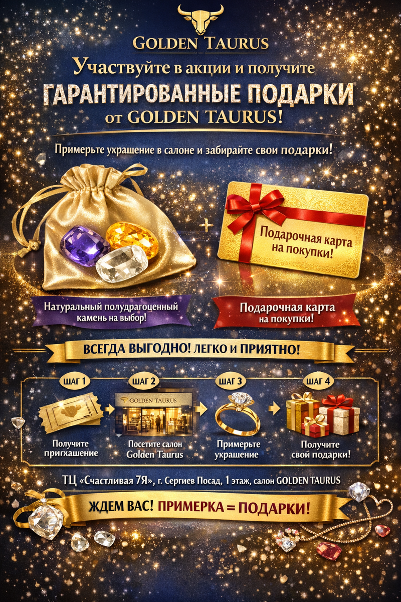 Мечтаете прикоснуться к миру ювелирного искусства и стать обладателем не просто украшения, а настоящего талисмана? Салон Golden Taurus в Сергиевом Посаде дарит вам уникальную возможность сделать это с особым блеском! Приглашаем вас принять участие в щедрой акции, где за простую примерку понравившегося изделия вас ждут два гарантированных подарка. Это не лотерея, а наш искренний жест внимания каждому гостю. Мы сделали процесс максимально легким и приятным, чтобы вы могли сосредоточиться на выборе украшений и получении эмоций. Шаг 1: Получите приглашение.