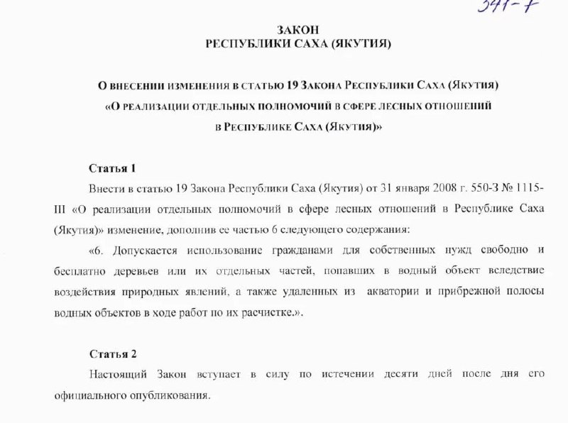 Депутаты Ил Тумэна (госсобрание) Якутии от Единой России разработали проект поправок в региональный закон о лесных отношениях, который разрешает жителям вылавливать деревья и ветки из водоемов. Законопроект на рассмотрение регионального парламента был внесен 3 февраля. Его текст гласит, что: «Допускается использование гражданами для собственных нужд свободно и бесплатно деревьев или их отдельных частей, попавших в водный объект вследствие воздействия природных явлений, а также удаленных из акватории и прибрежной полосы водных объектов в ходе работ по их расчистке». В пояснительной записке авторы инициативы утверждают, что она нацелена на сохранение водоемов «путем стимулирования и привлечения граждан на их очистку от древесины»