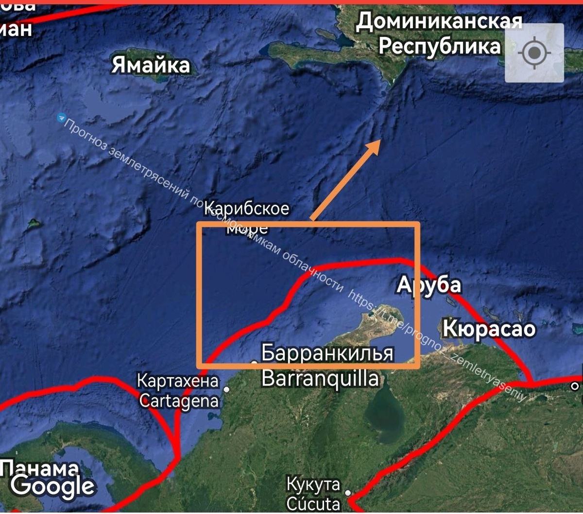 По югу Карибской плиты (Колумбия, Венесуэла) есть вероятность землетрясения М6+ в течение 9 дней.