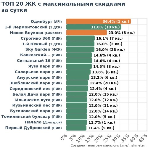🟩 Честные скидки: 52 ЖК (537 кв.) 🟧 Маркетинг скидки: 47 ЖК (496 кв.) 💎 МАКСИМАЛЬНАЯ ЭКОНОМИЯ 🏆 ФСК • Sky Garden ├🔻6.5M → 40.9M • 3-к 116м²❗️ ├🔻6.5M → 40.5M • 3-к 116м²❗️ └🔻6.1M → 38.2M • 3-к 116м²❗️ 🥈 1 ДСК • 1-й Лермонтовский ├🔻4.5M → 14.4M • 3-к 78м² ├🔻3.7M → 11.9M • 2-к 59м² └🔻3.7M → 11.9M • 2-к 59м² 🥉 ПИК • Амурский парк └🔻3.7M → 27.8M • 3-к 84м² 4️⃣ ПИК • Москворечье └🔻3.5M → 32.1M • 3-к 81м² 5️⃣ ПИК • Бусиновский парк └🔻3.4M → 28.6M • 3-к 83м² 🔑 САМЫЕ ДОСТУПНЫЕ 🏆 ПИК • Восточное Бутово ├🔻536к → 6.0M • Студия 28м²❗️ ├🔻613к → 6.8M • 1-к 33м² └🔻673к → 6.9M • 1-к 36м² 🥈 ПИК • Белая Дача парк ├🔻782к → 6.5M • Студия 20м² └🔻783к → 6.5M • Студия 22м² 🥉 ПИК • Ильинские луга └🔻826к → 6.9M • Студия 23м² 4️⃣ 1 ДСК • 1-й Донской ├🔻401к → 7.1M • Студия 24м² ├🔻404к → 7.1M • Студия 24м² └🔻410к → 7.2M • Студия 24м² ❗️— лоту меньше месяца 👇 Полная статистика: 📲 В Telegram | 🌐 На MskMeter.ru