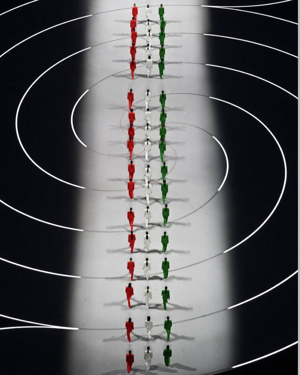 Джорджо Армани, король, как его называли итальянцы (il Re). На арену Олимпиады вышли 60 моделей в элегантных костюмах Giorgio Armani цветов итальянского флага. Обладательница премии «Грэмми» Лаура Паузини исполнила гимн Италии (в платье Armani Prive), а топ-модель Виттория Черетти (в платье Armani Prive) - лицо рекламной кампании Giorgio Armani SS26 - завершила олимпийское фэшн-шоу Giorgio Armani выносом флага Италии 💚🤍❤️
