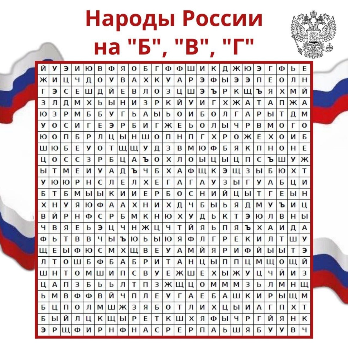 В сегодняшней головоломке 20 национальностей, названия которых начинаются на буквы: «Б», «В», «Г». Найдите все названия национальностей и напишите в комментариях. И помните: один ответ = один комментарий! Источник информации: https://xn--80aaaa1bcaqfbqcckfp8c4cxgsc.xn--p1ai/ #Единствонародов_России #СотрудничествоГП