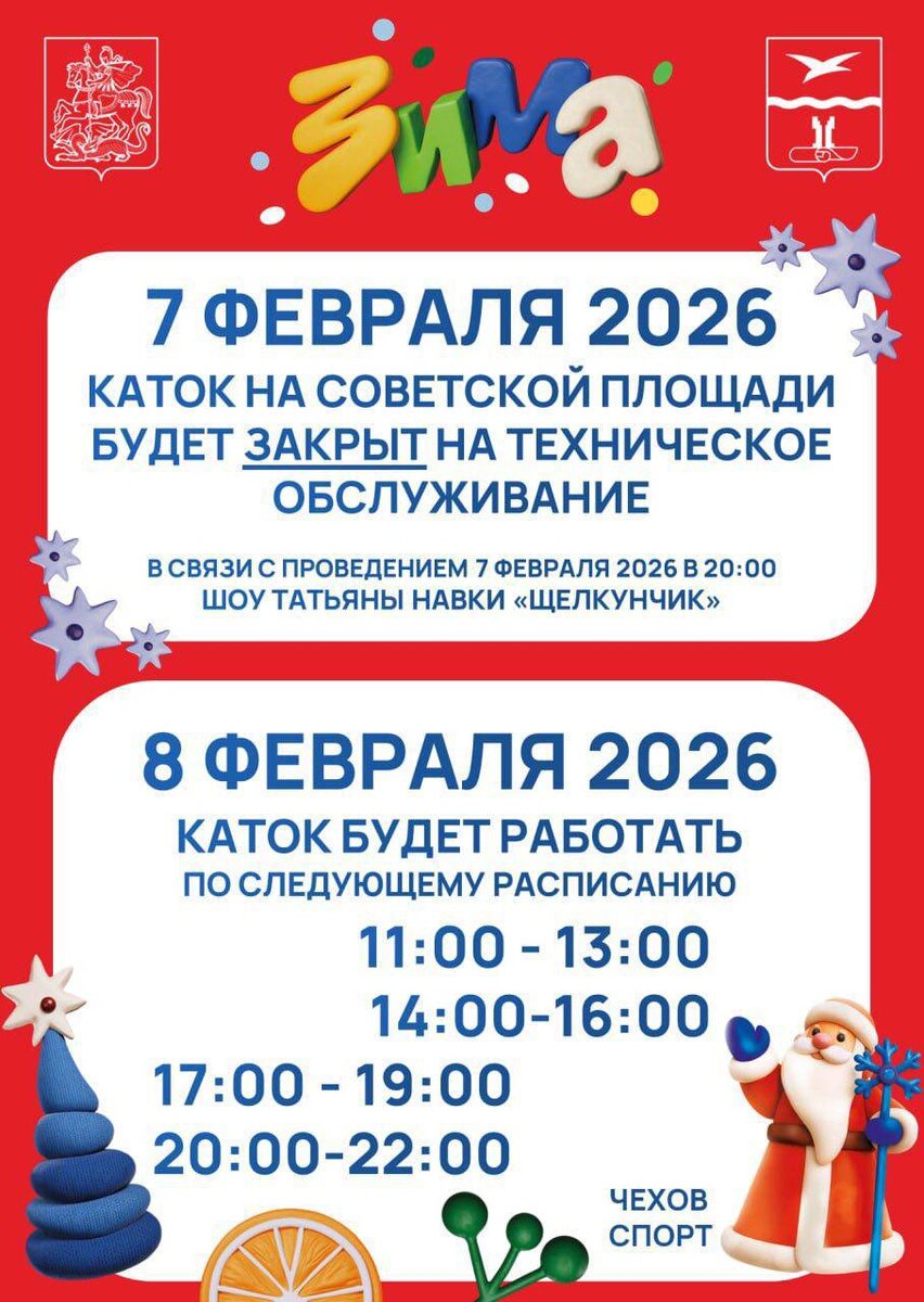 ⛸️ ⛸ В связи с проведением ледового шоу «Щелкунчик» ⛸️ 7 февраля каток будет закрыт на техническое обслуживание и парковка будет закрыта ⛔ ⛸️ 8 февраля каток будет работать в штатном режиме. Расписание сеансов 8 февраля: 🕓 11:00 – 13:00, 🕓 14:00 – 16:00, 🕓 17:00 – 19:00, 🕓 20:00 – 22:00. 🚪 Вход на каток свободный. Стоимость проката: детские коньки (до 33 размера) - 200 рублей, взрослые коньки - 300 рублей. ⛸ Ледовое шоу «Щелкунчик» состоится 7 февраля в 20:00. Вход на мероприятие свободный. 📆 07.02.2026 🏢 Площадь перед Администрацией 📍 г. Чехов, Советская пл., д.3 ⭐Поддержать канал голосом ✅ Мероприятия Чехов https://dzen.ru/id/66cc4b48e9ef144699238a51 http://vk.com/chekhov_events http://dzen.ru/chekhov_events