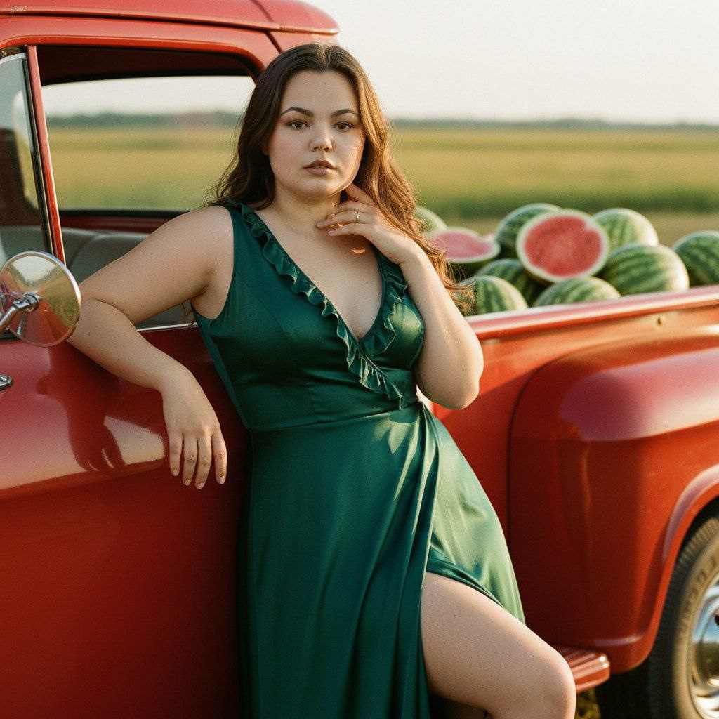 😀Выбираем "нейросети" 😀Нажимаем "Nano Banana" 😀Нажимаем "Nano Banana Pro" 😀Прикрепляем через скрепку свое фото и выбранный промпт 😀Наслаждаемся результатом😍 Создай фото не меняя черты лица и цвет волос "Фотореалистичный летний портрет: женщина в изумрудно‑тёмно‑зелёном сатиновом платье с рюшами по декольте и глубоким боковым разрезом, опирается на борт красного винтажного пикапа, кузов заполнен целыми и разрезанными арбузами; расслабленная сексуальная поза — одна рука свисает по борту, другая у шеи, нога выдвинута через разрез платья. Тёплый золотой час, мягкий боковой свет, контрастные насыщенные цвета (красный кузов vs зелёные арбузы и изумруд платья), лёгкое плёночное зерно, shallow DOF." Детали: ⦁ Одежда: атлас/сатин, плотная посадка в талии, рюши на лифе, глубокий боковой разрез, текстура блеска и складок видна. ⦁ Прическа: длинные каштановые волосы в мягких волнах, свободно спадают по плечам, лёгкий боковой пробор, несколько прядей у шеи. ⦁ Макияж: натуральный дневной —