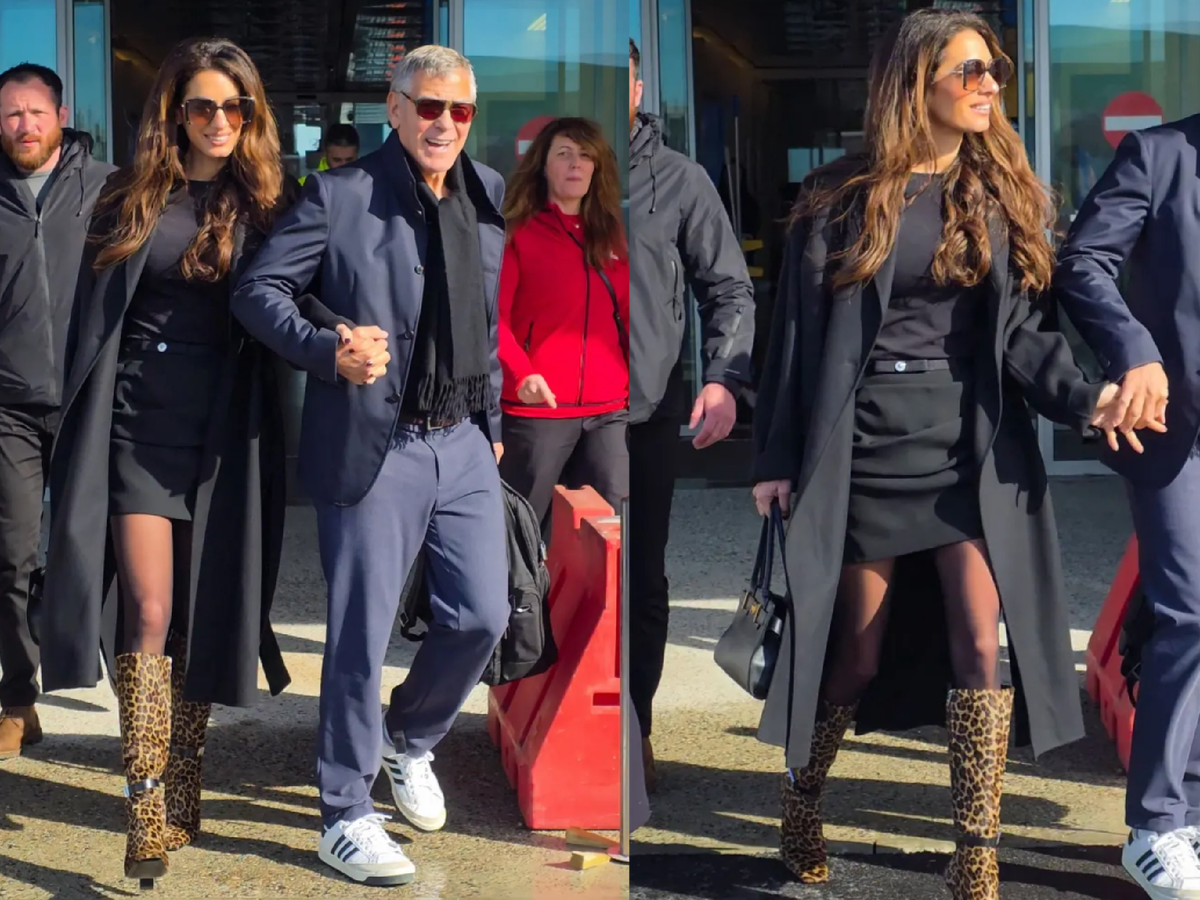 В Милане, накануне зимних Олимпийских игр 2026 года, Амаль и Джордж Клуни прилетели так, что их выход сразу попал в объективы камер. Ничего нарочитого, просто хороший стиль, который легко считывается и запоминается. Амаль выбрала образ Versace с головы до ног, явно поддержав Италию как страну хозяйку Игр. Чёрное пальто из шерсти и кашемира, мини юбка, сумка Medusa 95 и главный герой этого выхода - леопардовые сапоги. Именно они сделали образ живым, смелым и обсуждаемым. Леопард по прежнему остаётся в тренде, но сегодня его всё чаще носят аккуратно. Это приём, к которому часто обращаются минималисты. Когда хочется добавить характер, но не уходить в сложные сочетания. Один акцент, и образ сразу начинает работать. У Амаль Клуни этот приём выглядит особенно убедительно. Леопард не спорит с чёрным, а добавляет темперамент и делает выход запоминающимся. Джордж Клуни выбрал спокойный и понятный образ. Тёмно синие брюки, куртку в тон, чёрный шарф и удобные кроссовки Adidas. Всё просто, комфорт