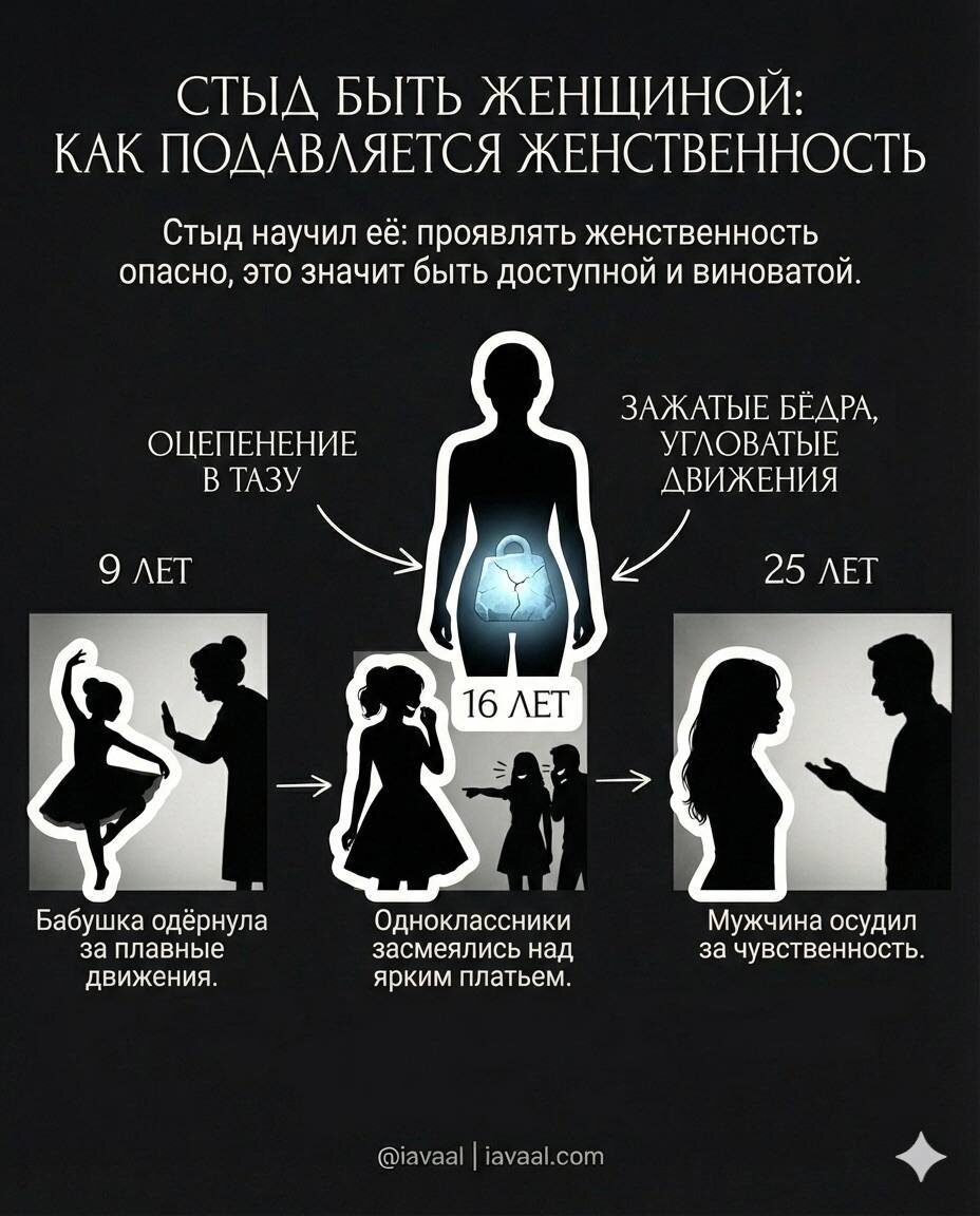 Женщина чувствует своё тело, чувствует желание быть красивой, желанной, живой, но тут же глушит это внутри, убирает яркость, прячет притягательность, делает себя нейтральной. Не потому что не хочет быть женщиной, а потому что стыд научил её простому правилу: проявлять женственность опасно, это значит быть доступной и виноватой. Ей было девять лет, когда она начала двигаться плавно и грациозно, бабушка одёрнула: не крутись, ведёшь себя как танцовщица. Девочка замерла и запомнила, что быть женственной стыдно. Ей было шестнадцать, когда она надела яркое платье и почувствовала себя красивой, одноклассники засмеялись: куда вырядилась, за кем охотишься? Она вернулась домой и больше не надевала ничего яркого. Ей было двадцать пять, когда мужчина сказал, что она слишком чувственная, слишком притягивающая внимание, и она поняла: проявлять женственность означает быть осуждённой. Стыд за собственную женскую природу оседает в области таза, бёдер и низа живота как оцепенение, которое невозможно р